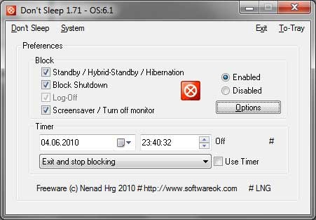Don't Sleep là một ứng dụng di động, không yêu cầu quá trình cài đặt phức tạp. Sau khi tải về, bạn chỉ cần giải nén và kích hoạt file thực thi DontSleep.exe để ngăn chặn Windows kích hoạt các chế độ Standby, Hybrid-Standby, Hibernation, Reboot, Shutdown, từ đó tránh mất quyền kiểm soát máy tính do các hoạt động ngầm mặc định của hệ điều hành.