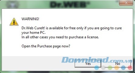 Sau khi nhấn Cancel để kích hoạt chế độ hoạt động thông thường, một hộp thoại sẽ xuất hiện hỏi bạn có muốn mua bản quyền phần mềm hay không. Thực tế, Dr.Web CureIt miễn phí cho người dùng cá nhân và chỉ yêu cầu người dùng doanh nghiệp mua bản quyền.