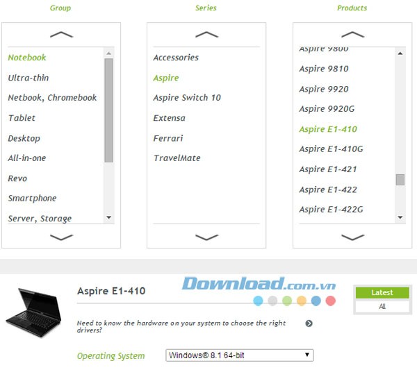 Hoặc nhập Product Model của máy: Acer Aspire E1-410.