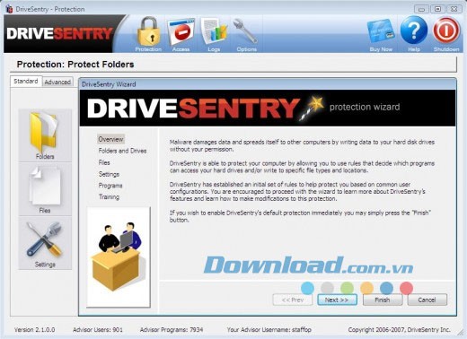 Nếu bạn là người mới sử dụng DriveSentry, nên chọn “Run Protection Wizard” để được hướng dẫn chi tiết từng bước cấu hình các quy tắc bảo vệ cho hệ thống.