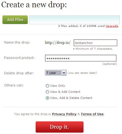 Cuối cùng, nhấn Drop it. Trang web có thể yêu cầu bạn đặt mật khẩu để quản lý tập tin, bạn có thể nhập mật khẩu hoặc bỏ qua bước này.