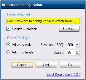Sau khi khởi động Dropresize, người dùng cần chọn Folder watched – thư mục mà phần mềm sẽ theo dõi và thực hiện thay đổi kích thước ảnh. Phần mềm sẽ liên tục giám sát thư mục này, và có thể bao gồm cả các thư mục con nếu được cấu hình.
