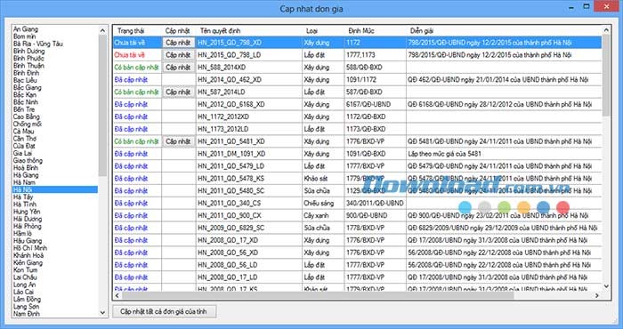 Dữ liệu được cập nhật liên tục, bao gồm các bảng tính lương nhân công, giá ca máy, phụ phí ca máy, chi phí vận chuyển và giá vật liệu theo từng địa phương.