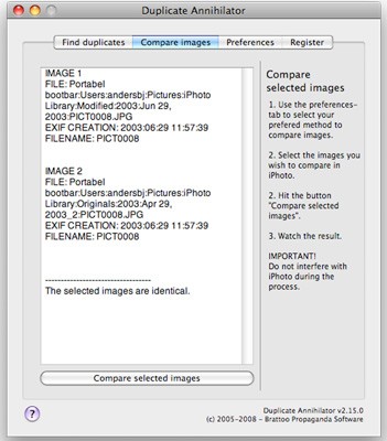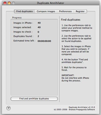 Phần mềm này nổi bật với sự đơn giản, tính gọn nhẹ và giao diện trực quan, dễ sử dụng. Duplicate Annihilator áp dụng các thuật toán tìm kiếm tiên tiến để xác định chính xác các file ảnh trùng lặp trong thư viện iPhoto của bạn.