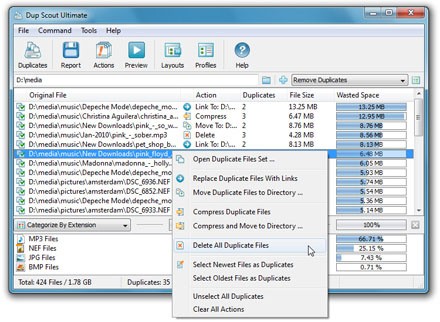 Từ menu chuột phải, người dùng có thể lựa chọn các hành động khác nhau đối với các file trùng lặp. Bạn có thể mở chúng trong Windows Explorer, thay thế các file trùng bằng liên kết, di chuyển chúng đến một thư mục khác, hoặc nén chúng lại.