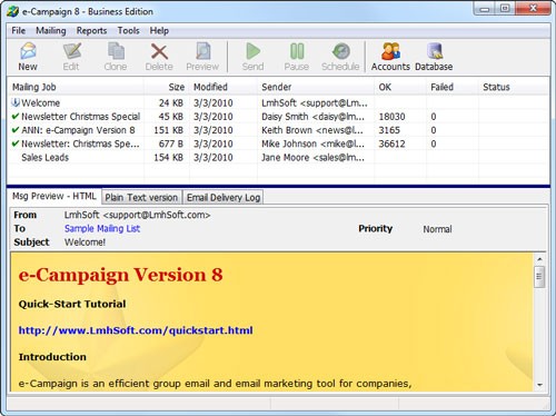 Điểm mạnh của e-Campaign nằm ở khả năng gửi toàn bộ nội dung một trang web trực tiếp vào inbox của người nhận. Ngoài ra, phần mềm còn tích hợp tính năng loại bỏ (remove) và hủy đăng ký (unsubscribe) một cách hiệu quả.