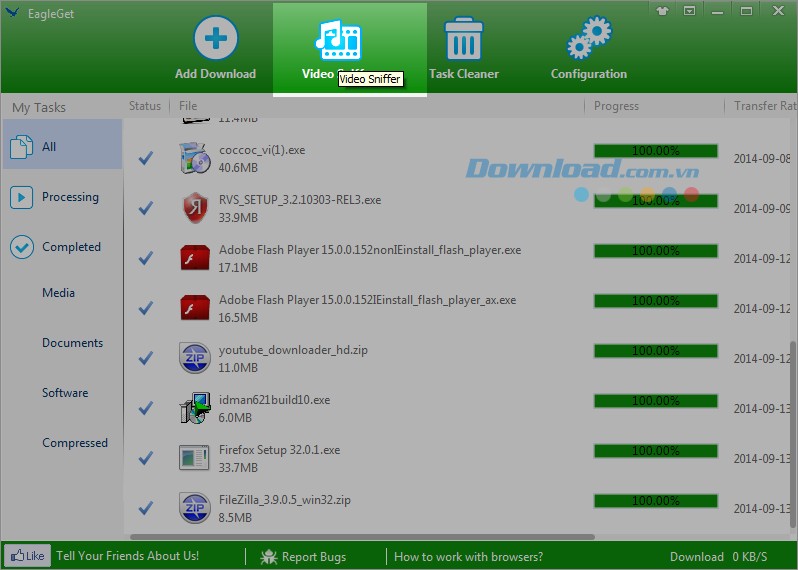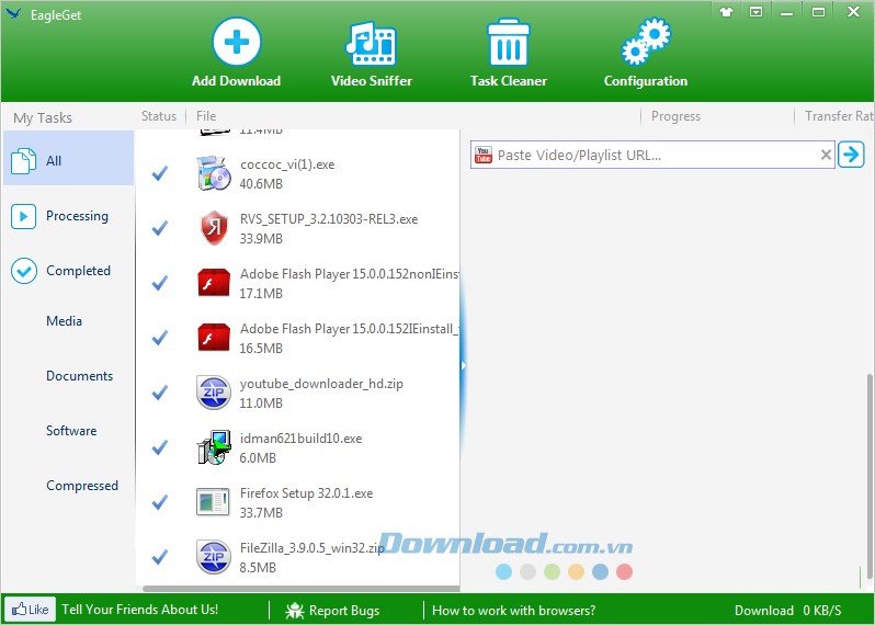 Phần mềm EagleGet tương thích hoàn toàn với nhiều giao thức phổ biến hiện nay, bao gồm HTTP, HTTPS, FTP, MMS và RTSP.