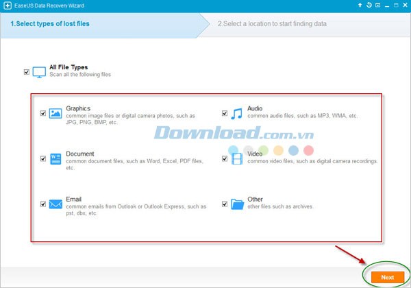 Khi chương trình được khởi chạy, việc đầu tiên cần thực hiện là chọn loại file cần khôi phục. Các định dạng file thông dụng được phân loại thành 6 nhóm chính: Graphic, Audio, Document, Email và Other. Tất cả các danh mục đều được chọn mặc định. Để tăng tốc độ quét, bạn chỉ nên chọn loại file cụ thể mà mình muốn tìm lại.