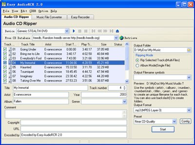Chọn định dạng âm thanh đầu ra tại ô Output Format và chất lượng âm thanh ở ô Preset. Chỉ định thư mục lưu trữ file đã chuyển đổi ở ô Specify Folder. Nhấn nút Start Conversion để bắt đầu quá trình chuyển đổi. Easy Audio RCR cũng cho phép bạn chỉnh sửa thông tin bài hát như tên ca sĩ, album, và tên bài hát.