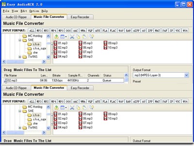 Để chuyển đổi định dạng file nhạc, bạn chọn thẻ Music File Converter. Nếu biết rõ định dạng nguồn, hãy chọn các nút tương ứng như MP3, MP2, MP4, MPG… Ngược lại, chọn ALL để phần mềm tự động xác định. Kéo và thả các file nhạc từ Explorer vào ô Drag Music Files To The Play List.