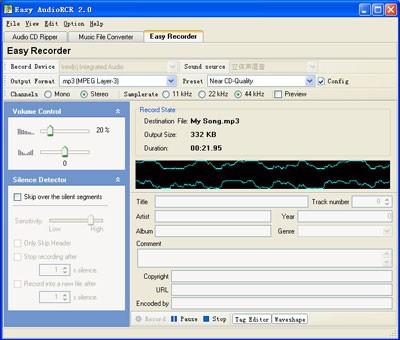 Chọn thẻ Easy Recorder để ghi âm. Chọn thiết bị thu âm thanh phù hợp ở ô Record Device. Chọn nguồn âm thanh từ ô Sound source (Microphone, Line In, Stereo Mixer…). Chọn định dạng âm thanh để lưu lại (MP3, WAVE, WMA…). Điều chỉnh chất lượng âm thanh ở ô Preset.