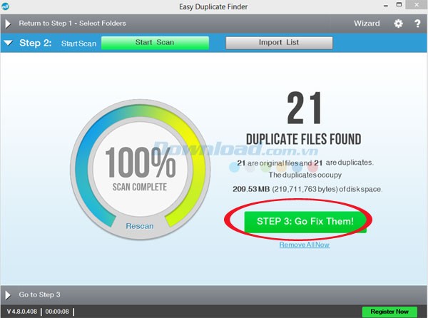 Khi quá trình quét thư mục hoàn tất, số lượng các tập tin trùng lặp được tìm thấy sẽ được hiển thị trên giao diện. Để tiến hành xử lý các tập tin này, hãy nhấn vào Go Fix Them.