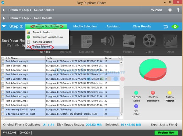 Tiếp theo, nhấp vào nút Manage Duplicates và chọn Delete Selected để bắt đầu xóa các file trùng lặp mà bạn đã chọn.