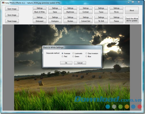 Đặc biệt, mỗi nút hiệu ứng đều đi kèm với một nút "Settings", cho phép bạn tùy chỉnh để thay đổi mức độ ảnh hưởng của hiệu ứng, chẳng hạn như tăng độ tương phản hoặc điều chỉnh màu sắc. Tuy nhiên, các thiết lập mặc định của phần mềm thường đã mang lại hiệu quả tốt, nên bạn không nhất thiết phải thay đổi chúng.