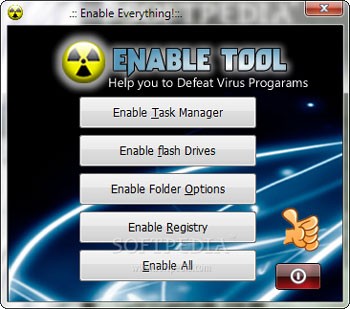 Enable Tool là một ứng dụng tiện ích được thiết kế nhỏ gọn, thân thiện với người dùng, giúp bạn khôi phục các chức năng quan trọng của hệ thống sau khi bị virus hoặc phần mềm độc hại tấn công.