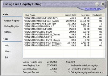 Eusing Free Registry Defrag được thiết kế để chống phân mảnh và thu gọn registry của Windows một cách nhanh chóng, thường chỉ trong vòng một phút. Phần mềm này sẽ quét toàn bộ registry nhằm giảm thiểu kích thước và lượng RAM mà registry chiếm dụng, từ đó cải thiện đáng kể hiệu suất của máy tính.