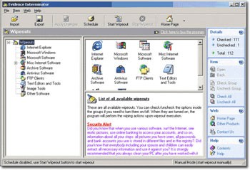 Evidence Exterminator cung cấp một hệ thống bảo mật toàn diện, đảm bảo sự riêng tư của bạn bằng cách hủy bỏ triệt để mọi thông tin liên kết với các hoạt động trực tuyến của bạn. Quá trình này có thể được thực hiện theo yêu cầu, theo lịch trình được người dùng tùy chỉnh, hoặc tự động mỗi khi khởi động hoặc tắt máy tính.