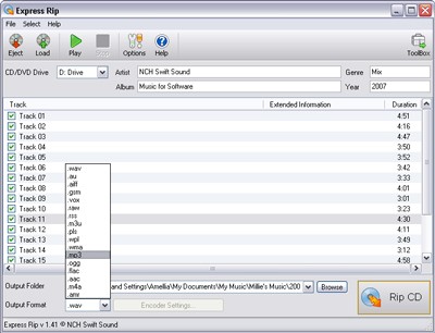 Express Rip 1.42 hỗ trợ xuất file sang các định dạng WAV, AU, AIFF, GSM, VOX, RAW, RSS, M3U, PLS, WPL, WMA, MP3, OGG, FLAC, AAC, M4A và AMR.