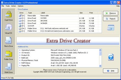Extra Drive Creator của WinTools Software Engineering mang đến những tính năng tương đương với các phần mềm tạo ổ đĩa ảo khác như Virtual Drive, nhưng được tối ưu hóa thành 5 công cụ chính trong một: