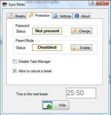Nhấn nút Hide để thu nhỏ giao diện phần mềm xuống khay hệ thống. Khi đến giờ nghỉ, màn hình máy tính sẽ bị khóa. Hãy tận dụng thời gian này để nhắm mắt, đi lại và thư giãn.
