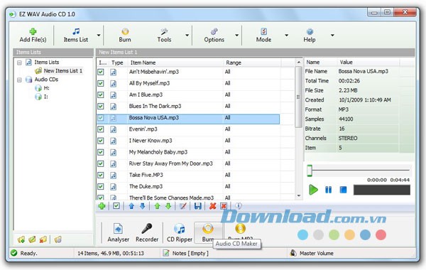 Hơn nữa, Audio Player của EZ WAV Audio CD cho phép bạn phát các file MP3, WAV, WMA trực tiếp mà không cần cài đặt thêm bất kỳ codec nào.