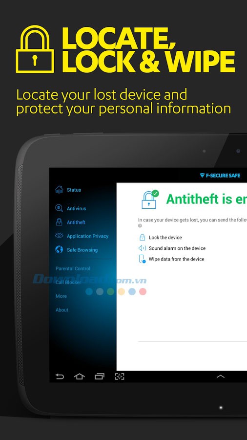 F-Secure Safe cho Android không chỉ dừng lại ở việc diệt virus, chống phần mềm gián điệp và ngăn chặn các hành vi lừa đảo. Nó còn mang đến nhiều tính năng vượt trội khác. Trong trường hợp thiết bị của bạn không may bị thất lạc hoặc rơi vào tay người khác, F-Secure Safe sẽ hỗ trợ định vị thiết bị đó.