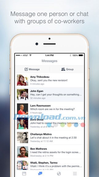 Hoàn toàn miễn phí trên các thiết bị iOS như iPhone, iPad và iPod Touch, Workplace cho phép người dùng tạo một hồ sơ riêng biệt cho mục đích công việc, tách biệt hoàn toàn với tài khoản Facebook cá nhân. Thông qua tài khoản Facebook at Work, bạn có thể tận dụng các tính năng quen thuộc của Facebook để giao tiếp với đồng nghiệp và cấp trên.