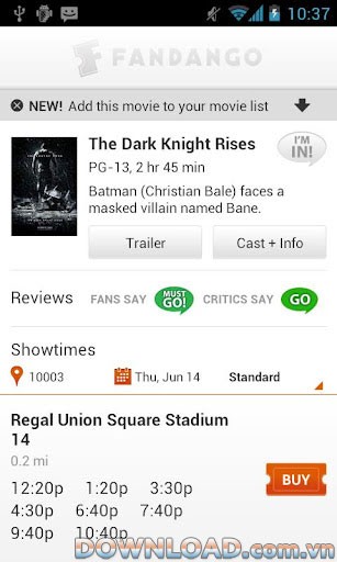 Ứng dụng Fandango Movies for Android mang đến trải nghiệm xem phim hoàn toàn mới, cho phép người dùng dễ dàng tìm kiếm danh sách các bộ phim đang chiếu và các rạp chiếu phim gần nhất.