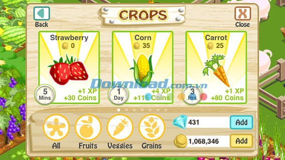 Game được liên tục cập nhật miễn phí với các loại trái cây, hoa, cây, công trình, đồ trang trí, vật nuôi mới mỗi tuần, mang đến những trải nghiệm bất ngờ.