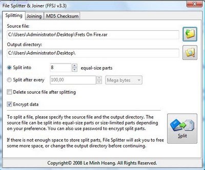 Giao diện của phần mềm được bố trí rõ ràng, chia thành ba phần chính: chia nhỏ file, ghép nối file và kiểm tra tính toàn vẹn, tương ứng với các tùy chọn Splitting, Joining và MD5 Checksum.