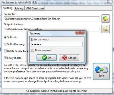 Nhấp vào nút Split. Nếu đã đánh dấu tùy chọn Encrypt Data, một hộp thoại sẽ xuất hiện yêu cầu nhập mật khẩu.