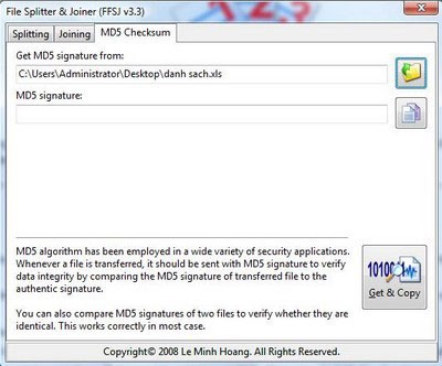 Ngoài hai tính năng chính là cắt và ghép file, FFSJ còn có chức năng kiểm tra mã MD5 để đảm bảo tính toàn vẹn của file và xác minh dữ liệu không bị thay đổi so với file gốc. Tính năng này đặc biệt hữu ích khi chia sẻ các file có dung lượng lớn hoặc dữ liệu quan trọng.
