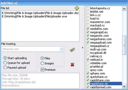 Nếu bạn sở hữu tài khoản trả phí, hãy tích vào ô Premium để chương trình upload bằng thông tin đăng nhập này. Theo mặc định, file chỉ được upload lên một trang web. Để tăng số lượng trang web đích, bạn chỉ cần mở rộng cửa sổ chương trình và chọn các hosting mong muốn. Cuối cùng, nhấn OK để khởi động quá trình upload.