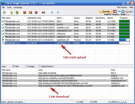 Quá trình upload sẽ diễn ra tuần tự trên từng trang web, và thông tin chi tiết sẽ được hiển thị ở phần trên của chương trình. Các liên kết download sẽ xuất hiện ở cửa sổ bên dưới, sẵn sàng để bạn chia sẻ với bạn bè.