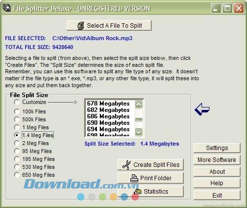 File Splitter Deluxe là một ứng dụng độc đáo, cho phép người dùng chia nhỏ các tập tin lớn thành nhiều phần. Điểm đặc biệt là quá trình nối lại các phần này không đòi hỏi phải cài đặt lại chương trình đã sử dụng để cắt, mang lại sự thuận tiện tối đa.