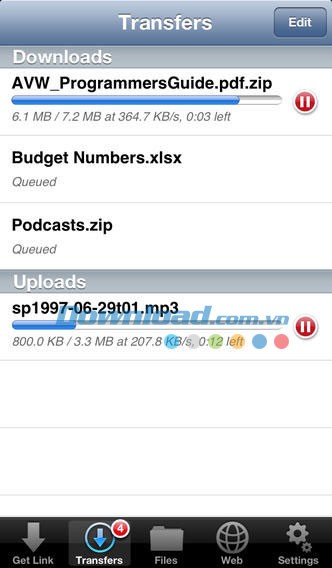 Filer Lite for iOS có một danh sách xếp hàng tải xuống, cho phép bạn theo dõi tiến trình tải, sắp xếp thứ tự và khởi động lại quá trình tải.