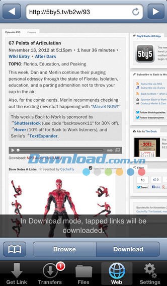 Sau khi tạo đánh dấu, hãy sử dụng Safari để duyệt trang web bạn muốn tải xuống nội dung. Gọi thực đơn đánh dấu và chạm vào đánh dấu tải xuống. Filer Lite sẽ khởi chạy và tải nội dung một cách nhanh chóng. Bạn cũng có thể sử dụng trình duyệt web tích hợp và nhập địa chỉ trang web.