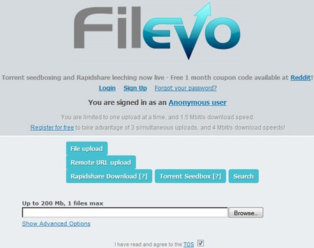 Với chế độ Anonymous, bạn có thể tải lên các tập tin cần chia sẻ ngay lập tức. Dung lượng tối đa cho mỗi tập tin là 100 MB, và tổng dung lượng lưu trữ được giới hạn ở mức 200 MB. Bạn chỉ có thể tải lên một tập tin duy nhất mỗi lần.