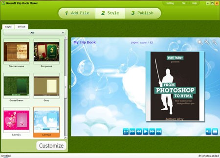 Nhấn vào nút Style trên giao diện chính của Ncesoft Flip Book Maker, bạn sẽ thấy 25 mẫu giao diện Flash bắt mắt khác nhau cho eBook. Bạn có thể nhấp vào một giao diện để xem trước nó trong khung bên phải.