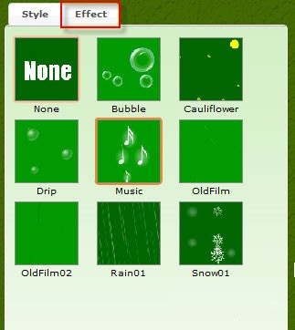 Để eBook thêm phần sinh động, hãy chuyển sang thẻ Effect và chọn các hiệu ứng như tuyết rơi, nốt nhạc bay, mưa hoặc hiệu ứng phim cũ để chèn vào giao diện.