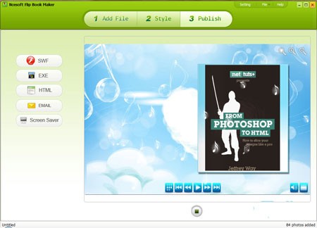 Giao diện của Ncesoft Flip Book Maker được thiết kế khá thân thiện với tông màu xanh nhạt. Ở phía trên, bạn sẽ thấy ba nút chức năng chính, đại diện cho ba bước để tạo nên một eBook lật trang độc đáo: Add File (thêm tệp), Style (chọn giao diện), Publish (xuất bản).