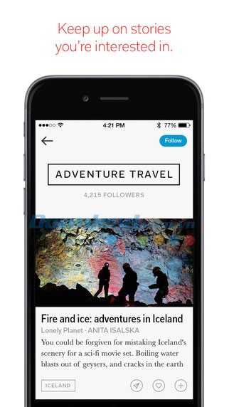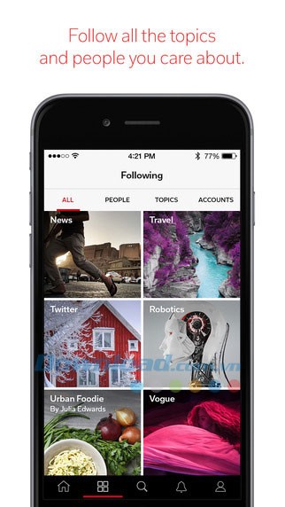 Từ các chuyên gia báo chí nổi tiếng đến độc giả thông thường, người dùng Flipboard từ khắp nơi trên thế giới đã tạo ra những cuốn tạp chí điện tử ấn tượng và độc đáo. Chủ đề trải dài từ công nghệ đến du lịch, đừng quên theo dõi những sự kiện mà bạn quan tâm và chia sẻ với bạn bè để cùng thảo luận.