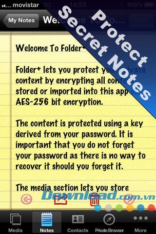 Về cơ bản, Folder+ for iOS hoạt động như một ứng dụng mã hóa nâng cao dành cho các thiết bị iDevice. Toàn bộ thông tin được lưu trữ trong ứng dụng sẽ được mã hóa bằng công nghệ AES-256 bit, đạt chuẩn bảo mật quân đội. Quá trình này sử dụng mật khẩu được tạo ra thông qua 10.000 vòng lặp của PBKDF2.