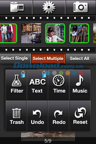 Có tới 18 bộ lọc ảnh độc đáo để thay đổi diện mạo của mỗi bức ảnh trong video. Chỉ cần một chạm để áp dụng bộ lọc cho từng ảnh và xem trước kết quả. Bạn có thể áp dụng bộ lọc riêng lẻ cho từng ảnh bằng nút Apply, hoặc sử dụng chung một bộ lọc cho tất cả ảnh bằng cách nhấn Apply All. Nếu muốn hoàn tác, hãy nhấn Cancel để khôi phục ảnh gốc và áp dụng lại từ đầu. Tính năng Preview cho phép bạn xem trước hiệu ứng của mọi chức năng trước khi áp dụng chính thức.