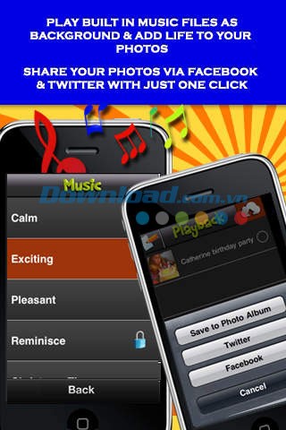 Trong mục Playback, bạn có thể xem lại video nhạc đã tạo. Nhấn Play để xem video ảnh, xóa, lưu lại hoặc tải lên Twitter và Facebook. Để xóa một slide show nhạc, vuốt lên slide show đó và nhấn nút Delete để xóa vĩnh viễn. Để chia sẻ, nhấn nút Upload, chọn video muốn tải lên và chia sẻ hoặc lưu vào thư mục Photos. FotoSlides Lite giúp bạn chia sẻ những video chất lượng cao, ấn tượng với bạn bè và người thân mọi lúc, mọi nơi.