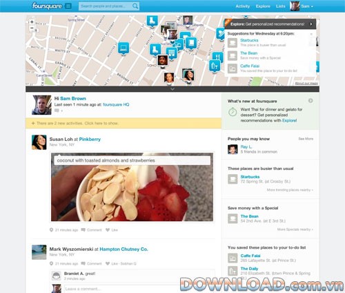 foursquare là một ứng dụng tiện ích giúp bạn và những người bạn cùng xây dựng danh sách những địa điểm ưa thích và dễ dàng chia sẻ thông tin này lên mạng xã hội Facebook.