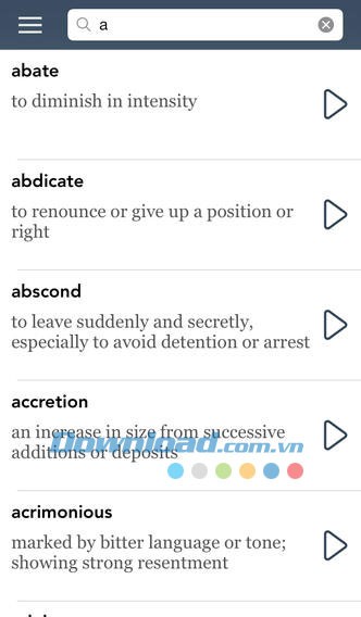 Toàn bộ danh sách từ vựng sẽ được tìm kiếm dễ dàng. Bắt đầu nhập vào ô tìm kiếm ở phía trên màn hình, các kết quả tìm kiếm sẽ thu hẹp theo từng ký tự được nhập.