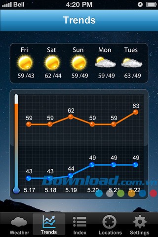 Bản đồ xu hướng nhiệt độ trực quan, hiển thị sự thay đổi nhiệt độ trong 5 ngày gần nhất.