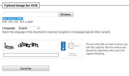 Nhập đoạn mã xác nhận hiển thị bên dưới và nhấn nút Send File để bắt đầu quá trình tải lên và nhận dạng văn bản.