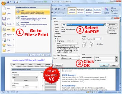 Quy trình thực hiện rất đơn giản: mở tài liệu bằng bất kỳ phần mềm nào (ví dụ: Microsoft Word, WordPad, Notepad), chọn lệnh Print và chọn doPDF (tên gọi khác của Free PDF converter). Sau khi hoàn tất, chương trình sẽ yêu cầu bạn chỉ định vị trí lưu tập tin PDF và tự động mở nó bằng trình xem PDF mặc định.